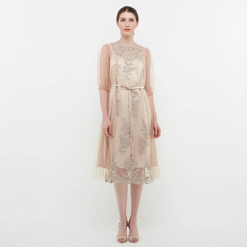 Untuk momen lebih formal seperti jamuan makan malam, kamu bisa mengandalkan dress bergaya elegan. Koleksi Cocktail Dress Embroidered Tulle dari label Atelier Mode mengombinasikan dress sutra dengan luaran berbahan tulle dan aksen bordir. Padanan palet warna emas dan nude membuat tampilan satu rona yang selaras. Selain menciptakan siluet ramping, aksen tali pada bagian pinggangnya juga menegaskan impresi elegan dari gaun ini.